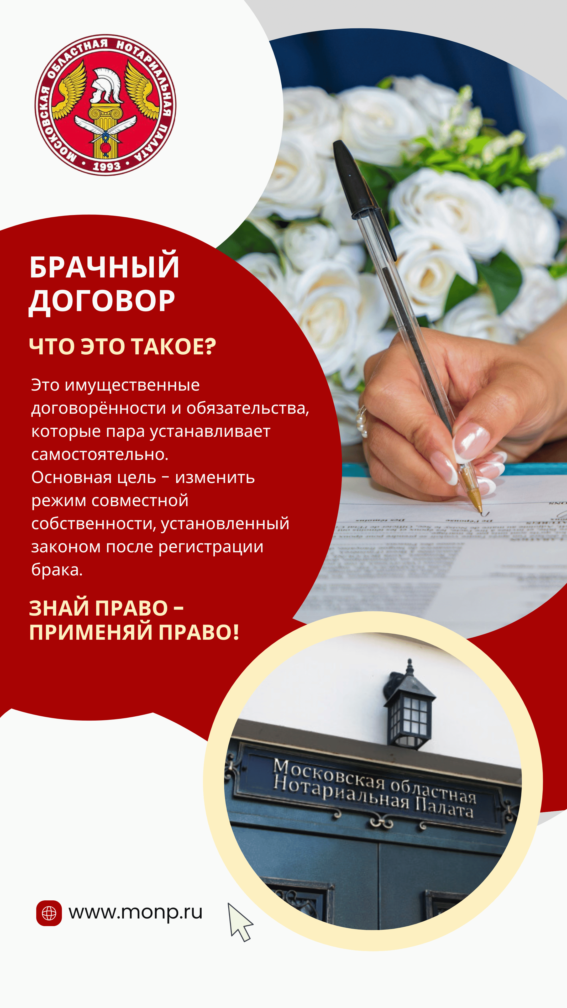 В соответствии с семейным законодательством законным режимом имущества супругов является режим их совместной собственности. Однако существует возможность изменить установленный законом общий подход к урегулированию имущественных правоотношений супругов. В российском праве существует такое понятие, как «договорный режим имущества супругов», который предполагает право супругов (или лиц, вступающих в брак) заключить брачный договор, который определяет их имущественные права и обязанности в браке и/или в случае его расторжения. Это имущественные договорённости и обязательства, которые пара устанавливает самостоятельно.