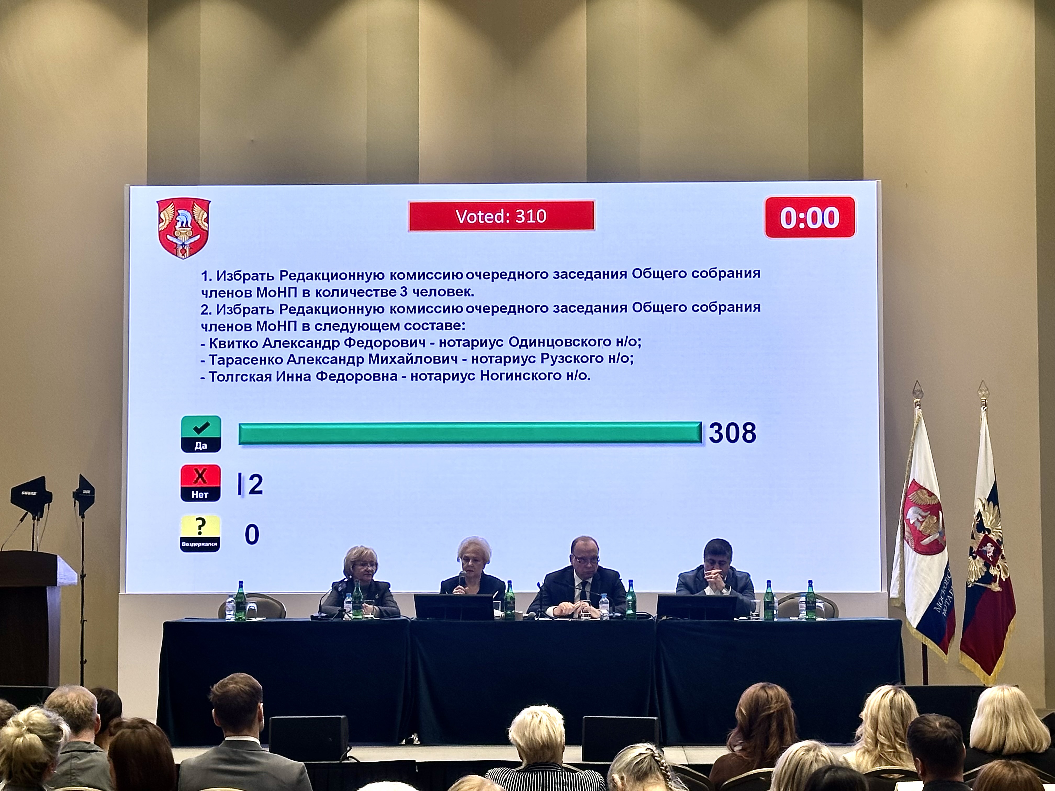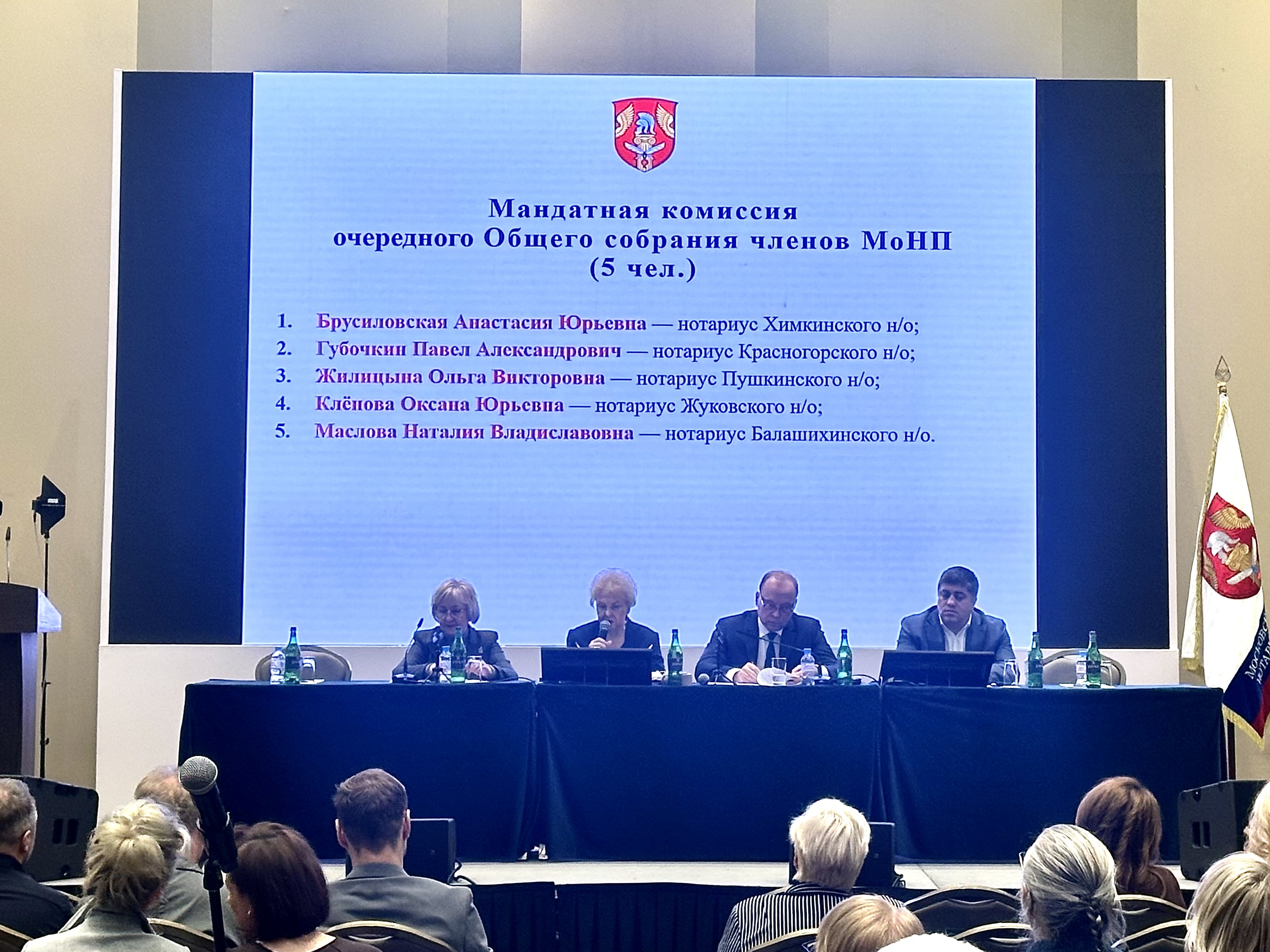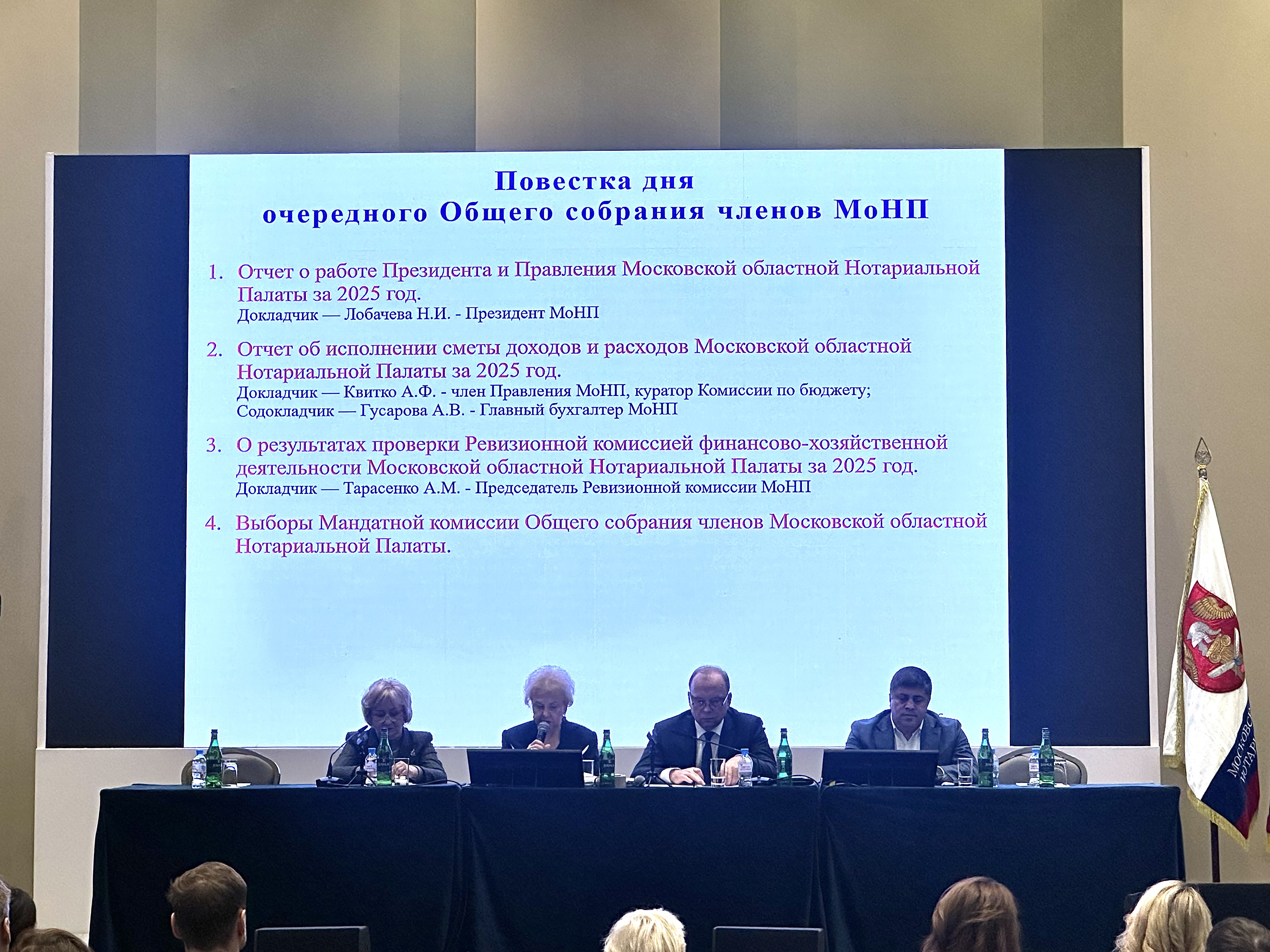 На Общем собрании нотариусов была избрана мандатная комиссия, утверждены отчет о работе Президента и Правления МоНП за 2025 год, отчет об исполнении сметы доходов и расходов МоНП за 2025 год и Акт Ревизионной комиссии за 2025 год.