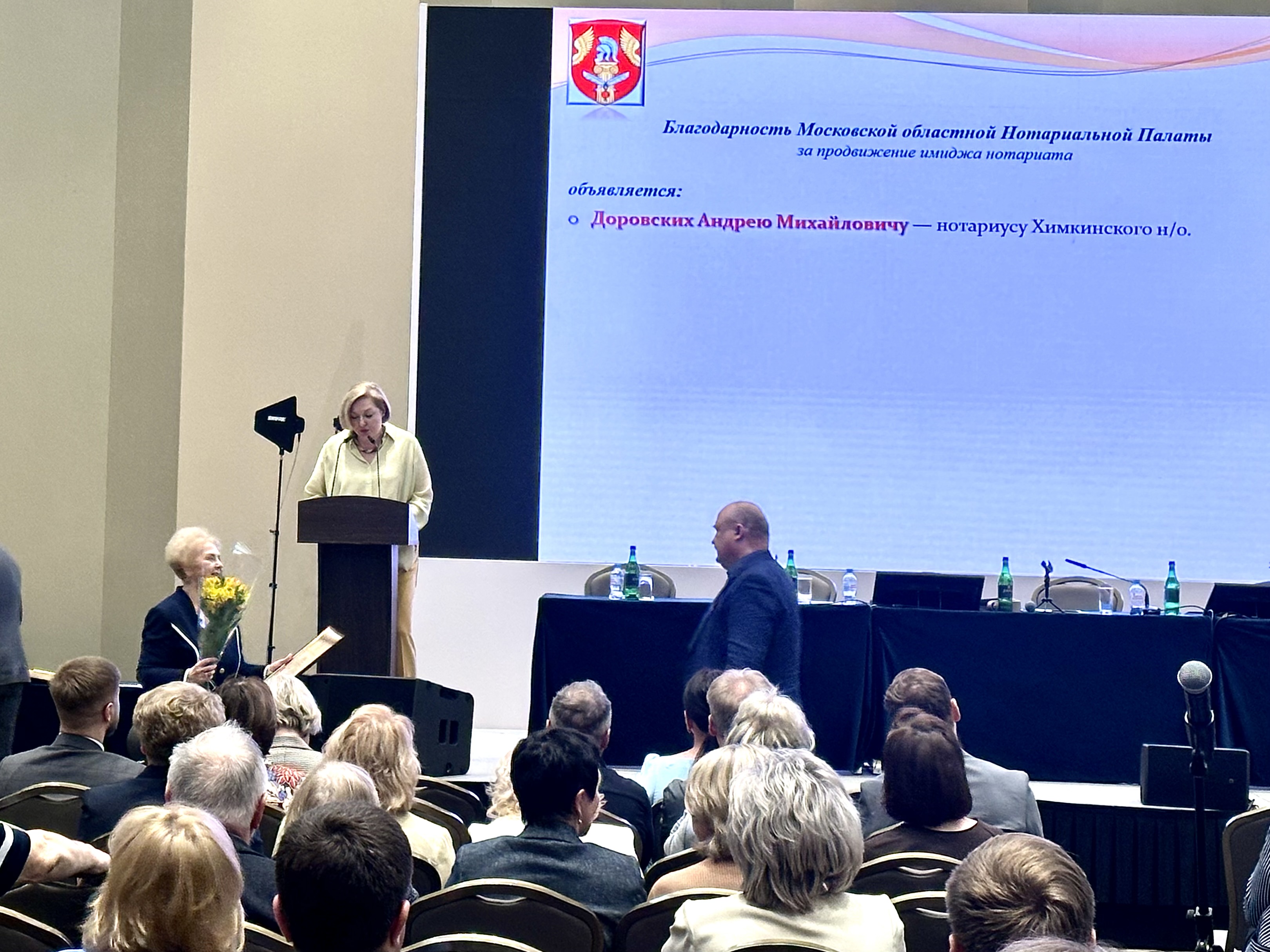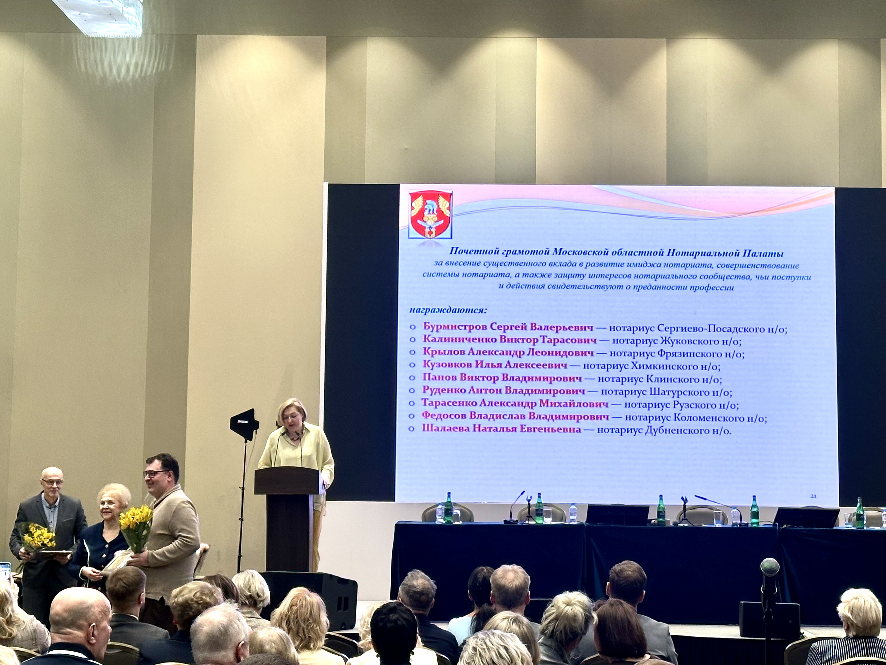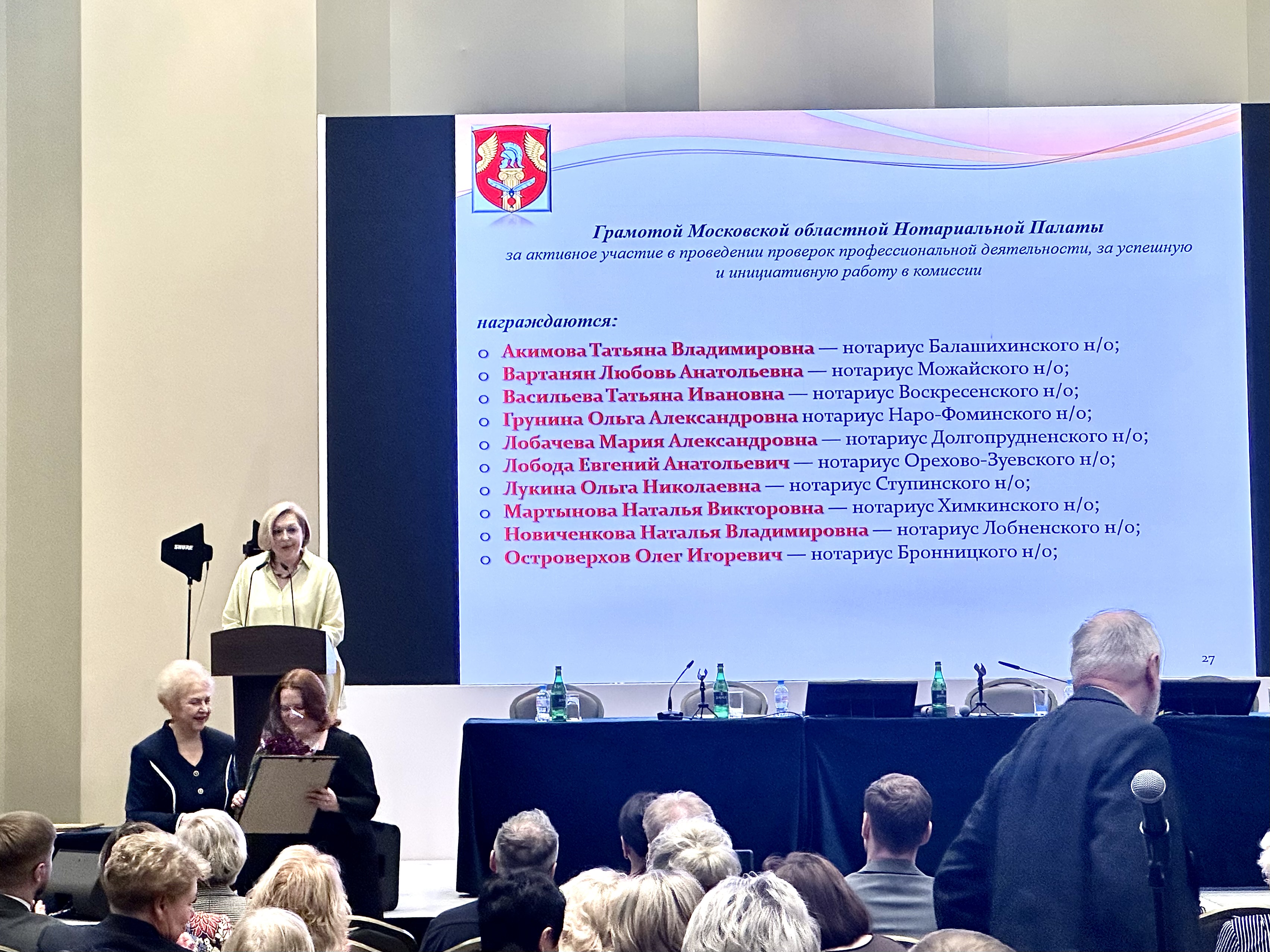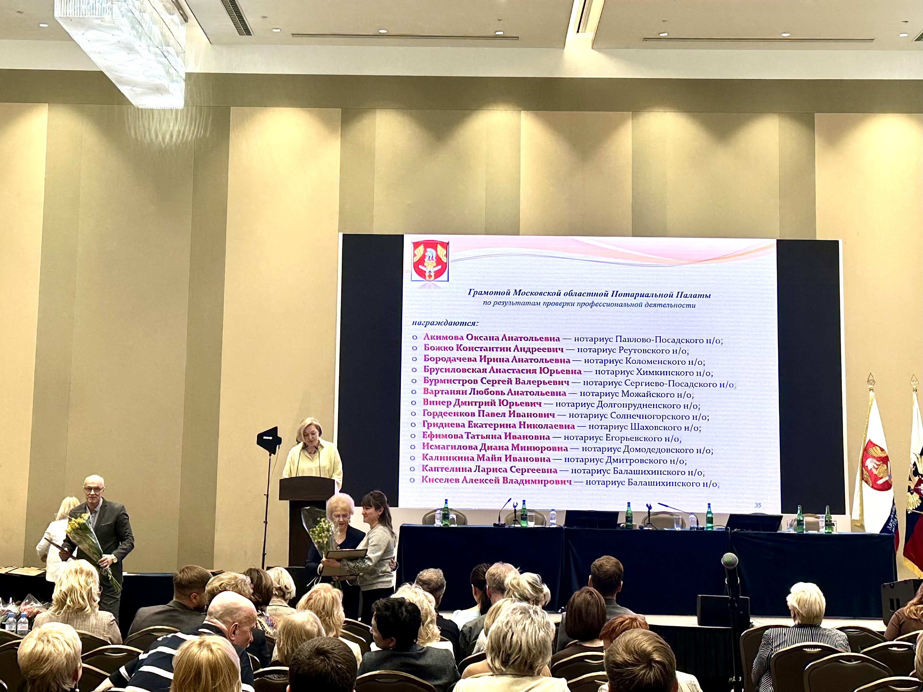 Также в ходе собрания состоялось награждение нотариусов наградами Управления Минюста России по Московской области, а также почётными грамотами и ценными подарками от Московской областной Нотариальной Палаты.