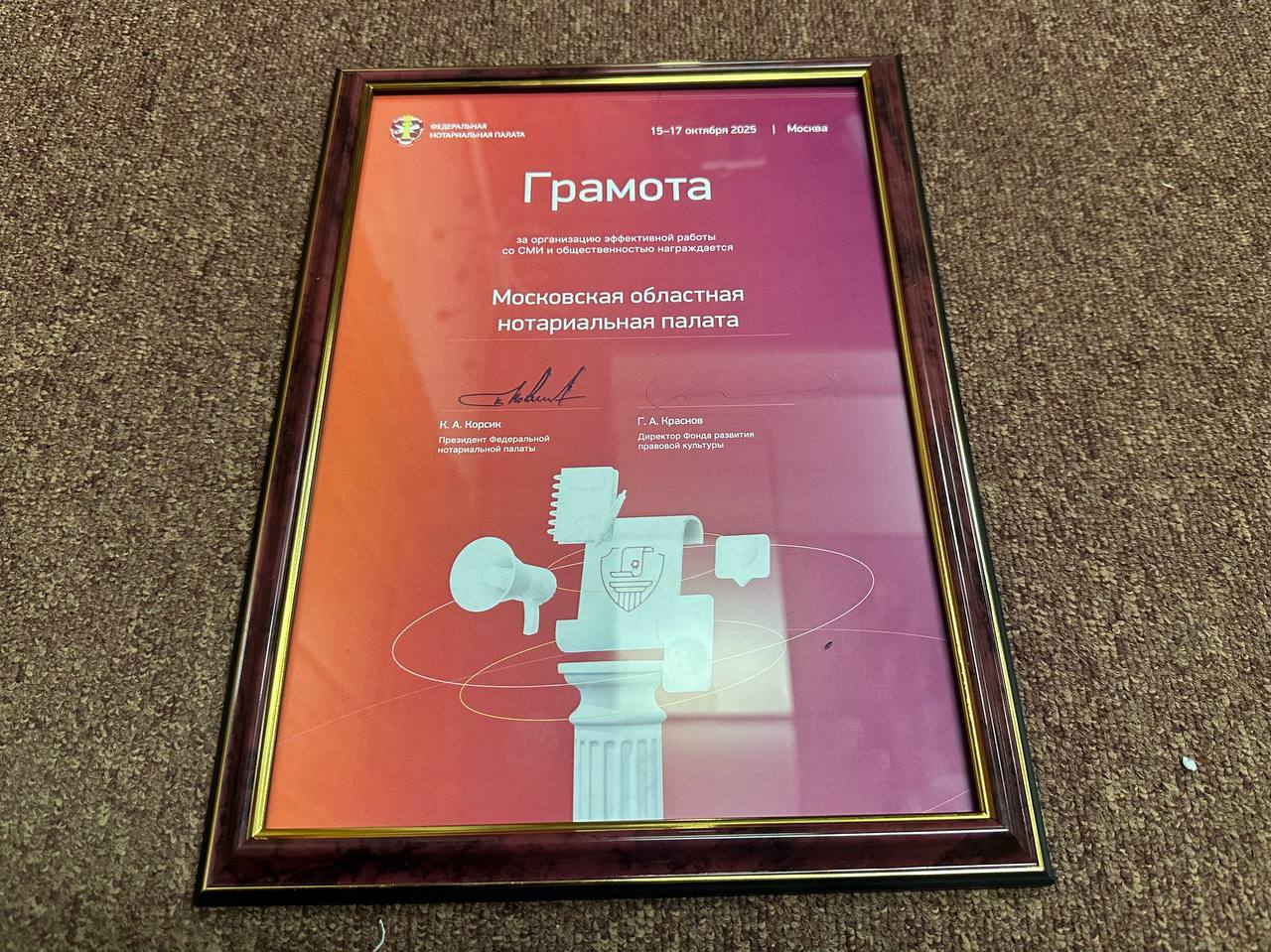 Московская областная Нотариальная Палата была награждена Грамотой Федеральной нотариальной палаты за организацию эффективной работы со СМИ и общественностью.