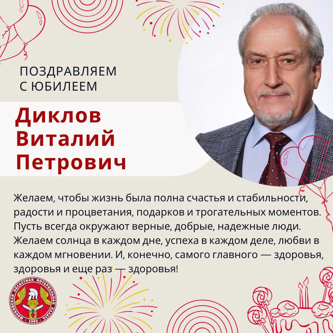Московская областная Нотариальная Палата поздравляет с Юбилеем Диклова Виталия Петровича! 27 февраля 2026 | |||||