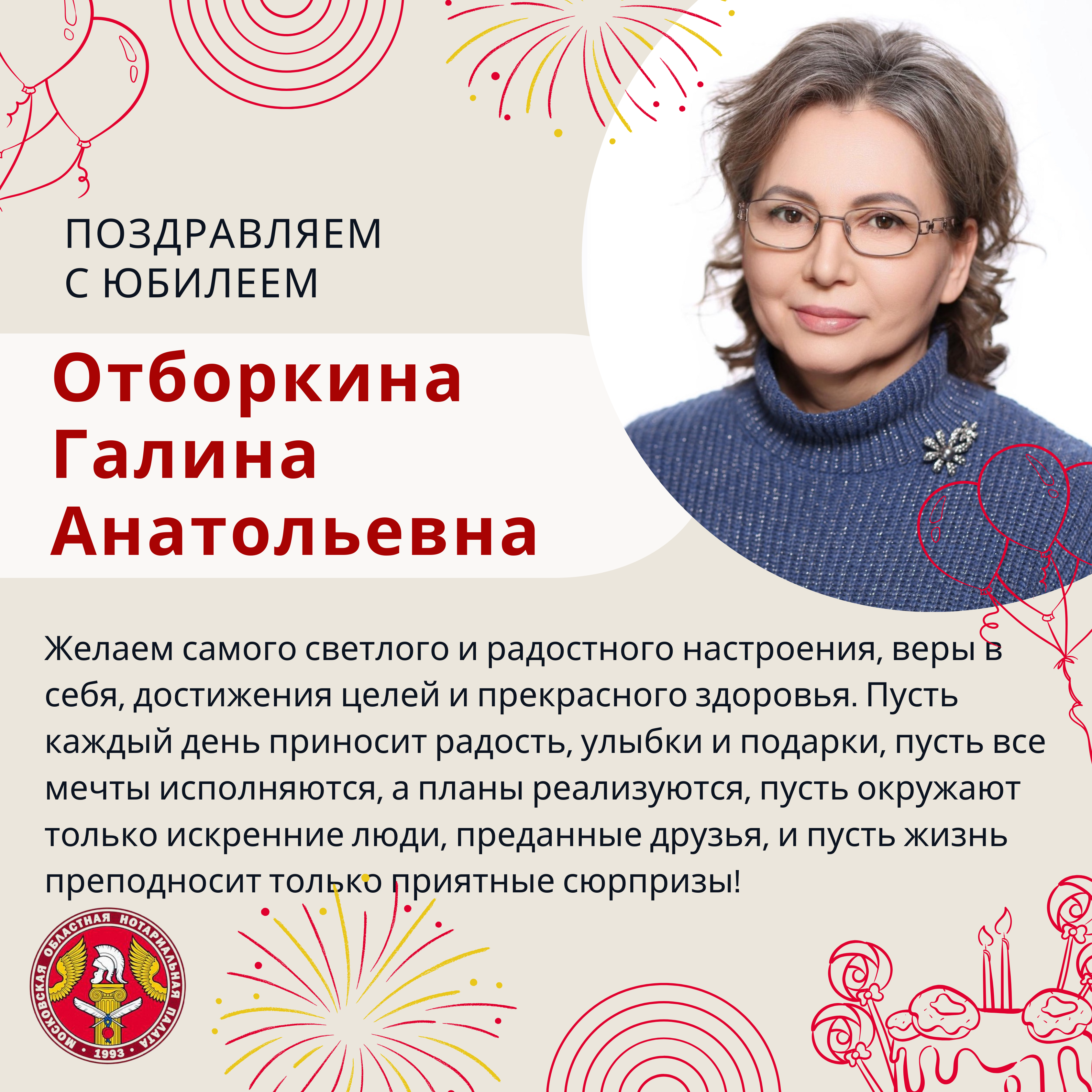 Московская областная Нотариальная Палата поздравляет с Юбилеем Отборкину Галину Анатольевну!