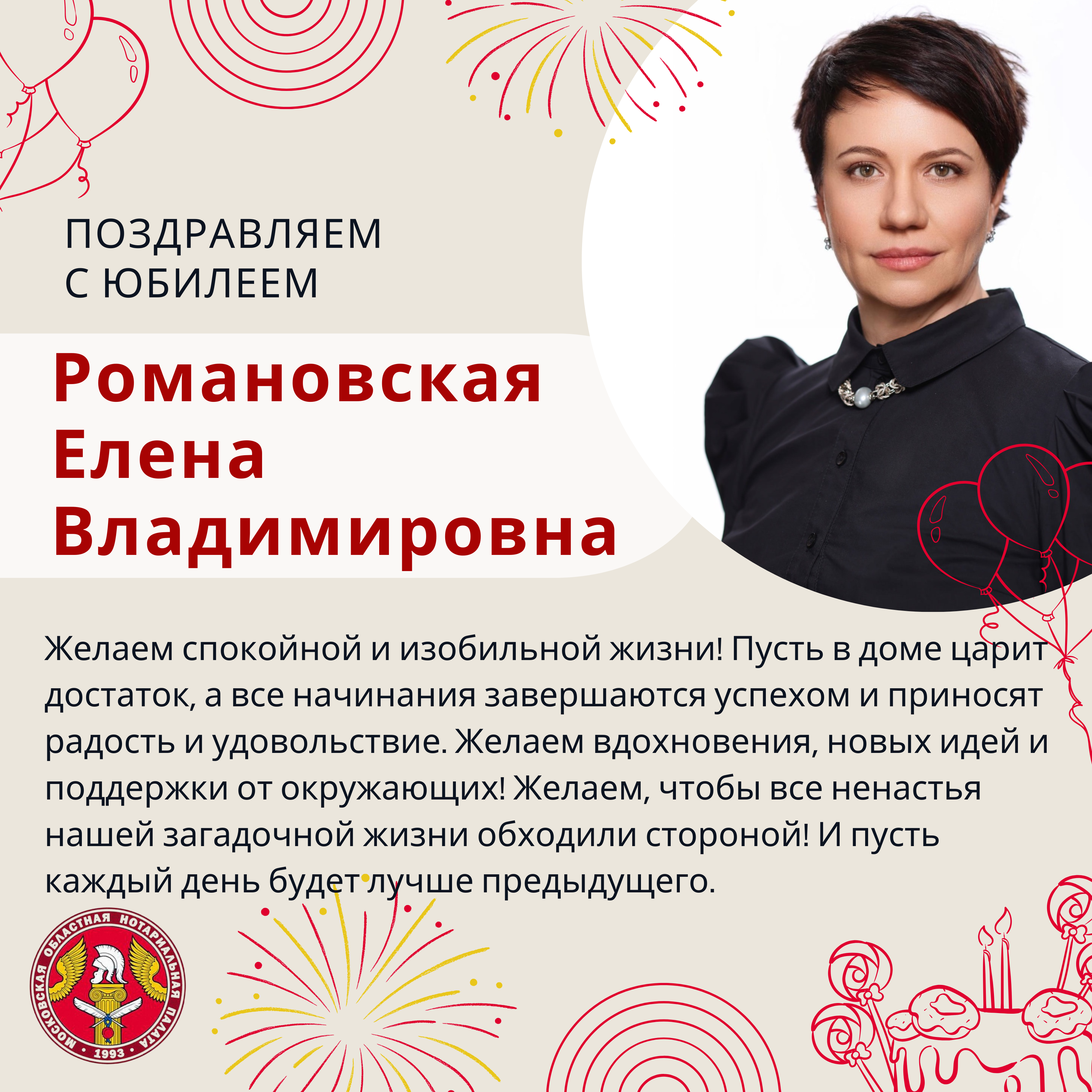 Московская областная Нотариальная Палата поздравляет с Юбилеем Романовскую Елену Владимировну!