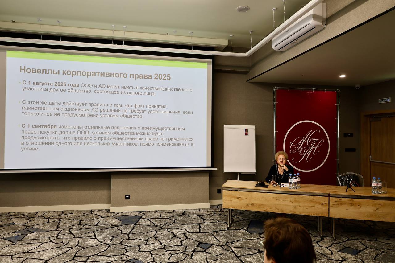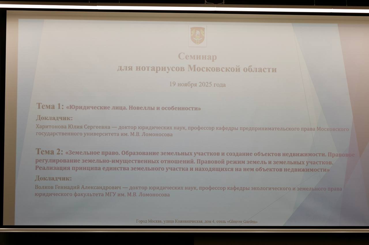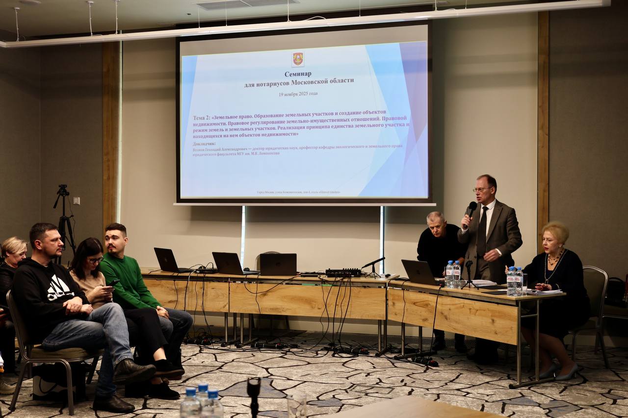 19 ноября 2025 года в Москве по адресу улица Кожевническая, дом 4 состоялся семинар для нотариусов Московской области на темы: «Юридические лица. Новеллы и особенности» и «Земельное право. Образование земельных участков и создание объектов недвижимости. Правовое регулирование земельно-имущественных отношений. Правовой режим земель и земельных участков. Реализация принципа единства земельного участка и находящихся на нем объектов недвижимости».